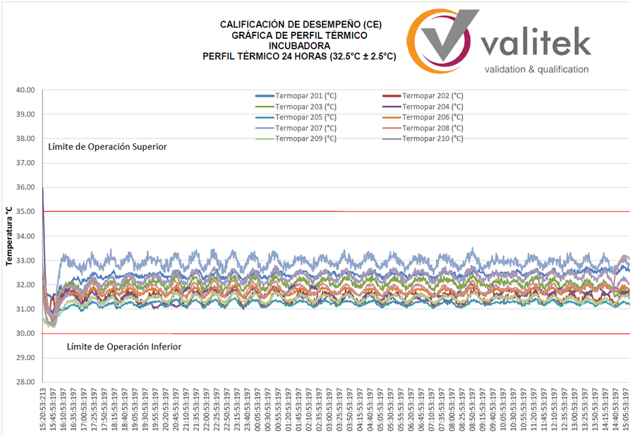 Valitek cuenta con equipos calibrados y/o trazados ante instituciones certificadas a nivel nacional e internacional (Cenam, Nist, etc), con el fin de poder llevar a cabo los estudios pertinentes de monitoreo de la temperatura (perfil térmico), con lo cual, al finalizar, se evaluará el estado del equipo y las diferentes temperaturas dentro del mismo, determinando con estos resultados, las áreas de mayor y menor temperatura, tanto en cámara vacía como en cámara conteniendo producto (Calificación de operación y desempeño).